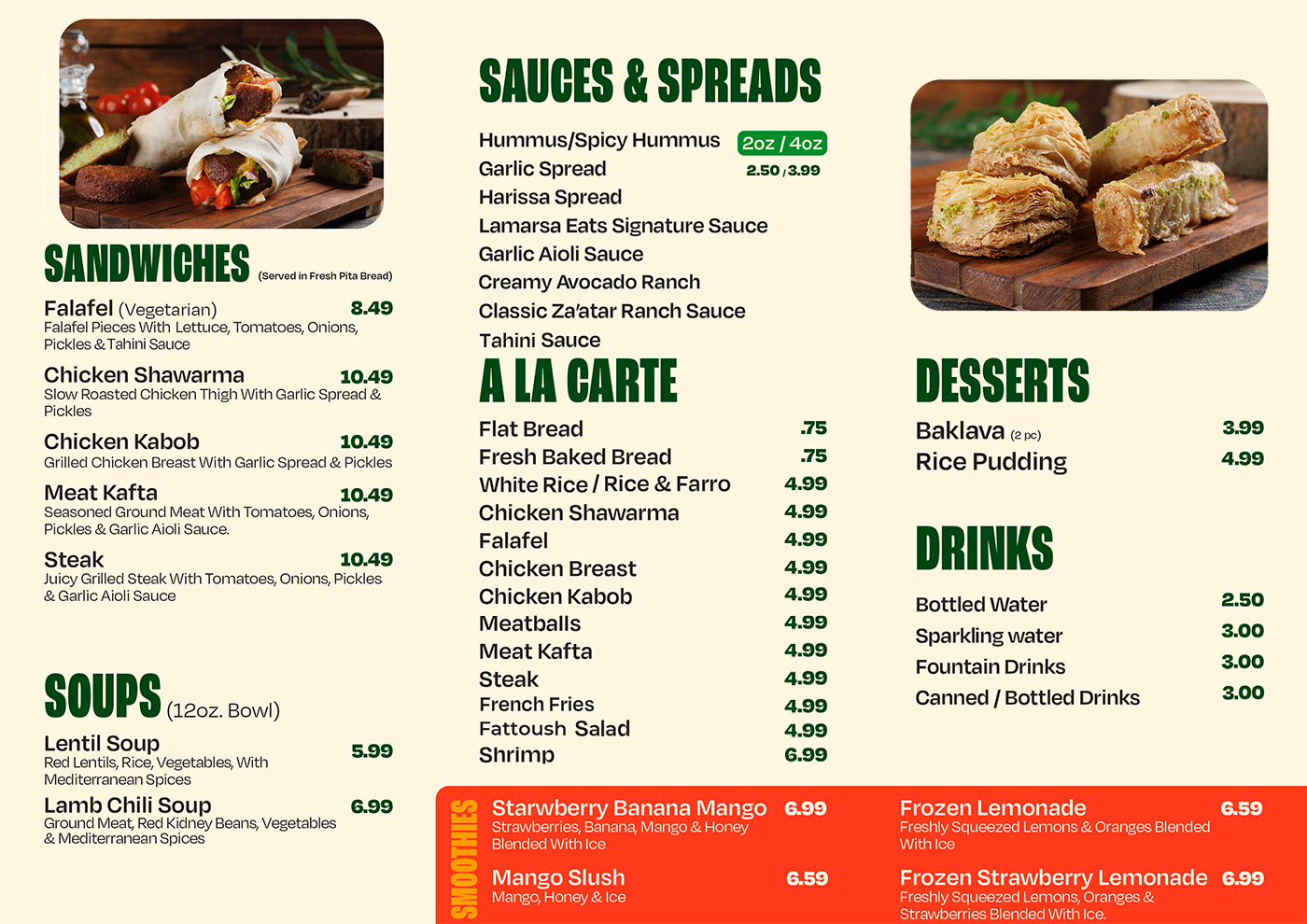 The La Marsa Eats menu brings together bold Mediterranean flavor, fresh ingredients, and the speed of fast casual dining. Our focus is simple: customizable bowls and wraps made with halal proteins, vibrant vegetables, and house-made sauces, all prepared fresh to order.